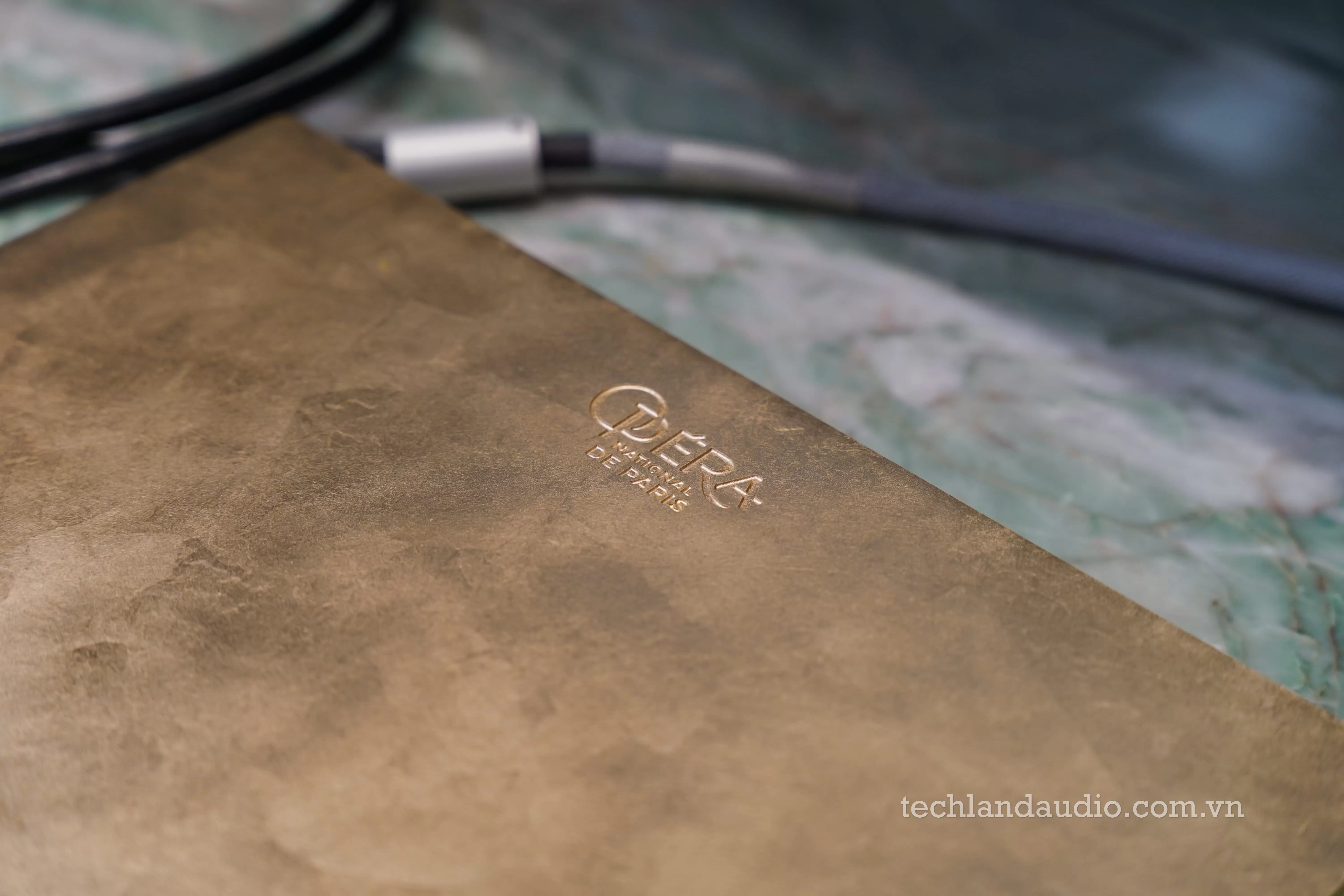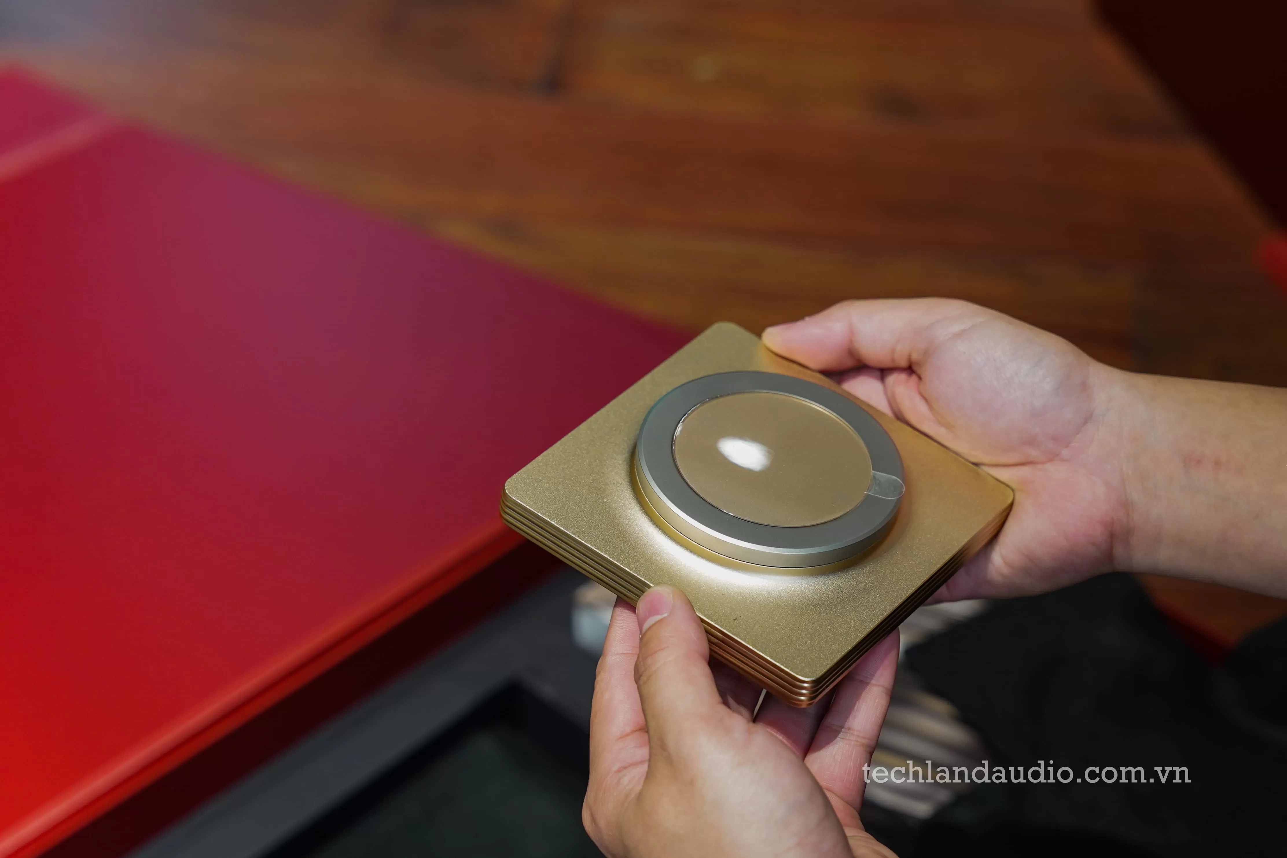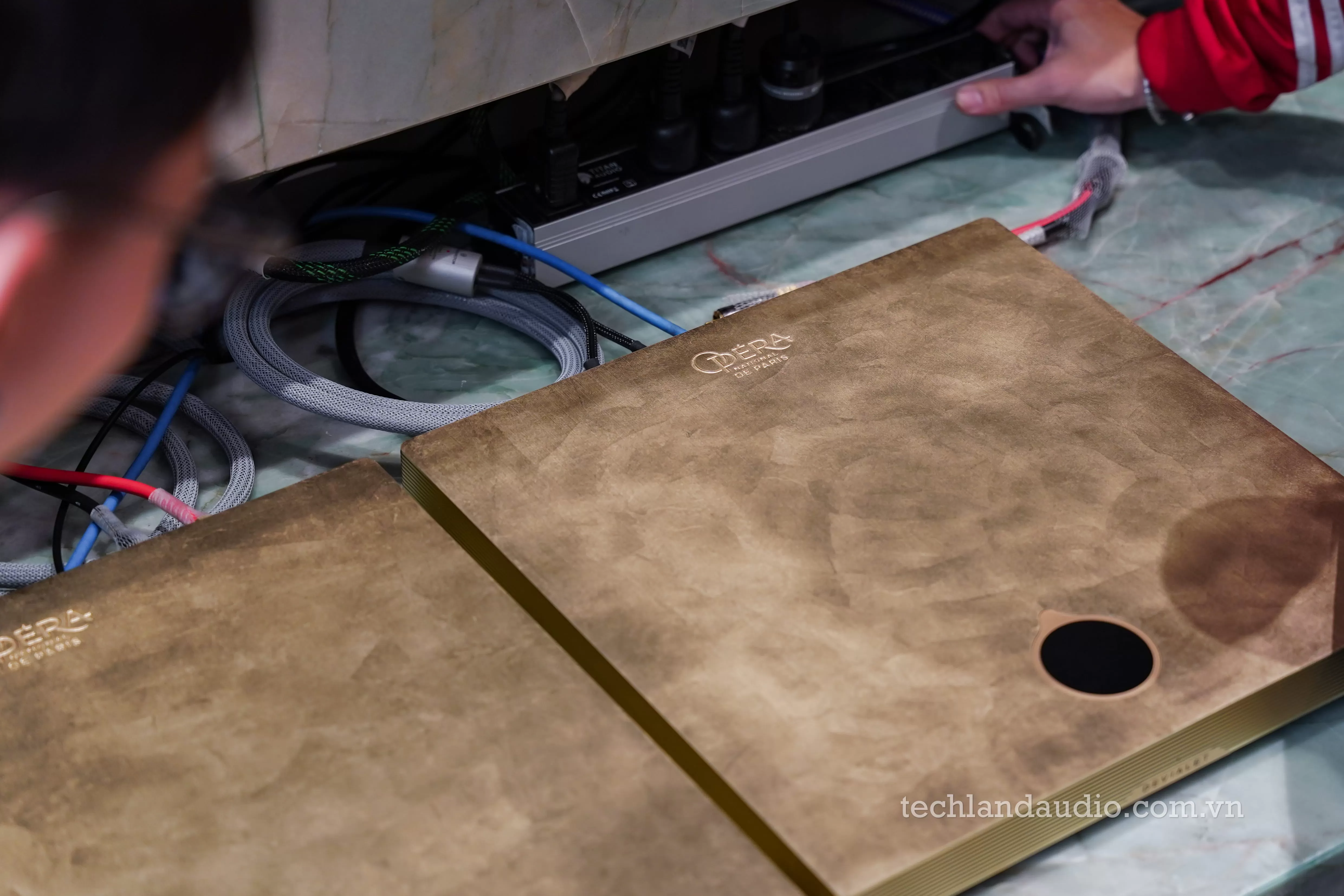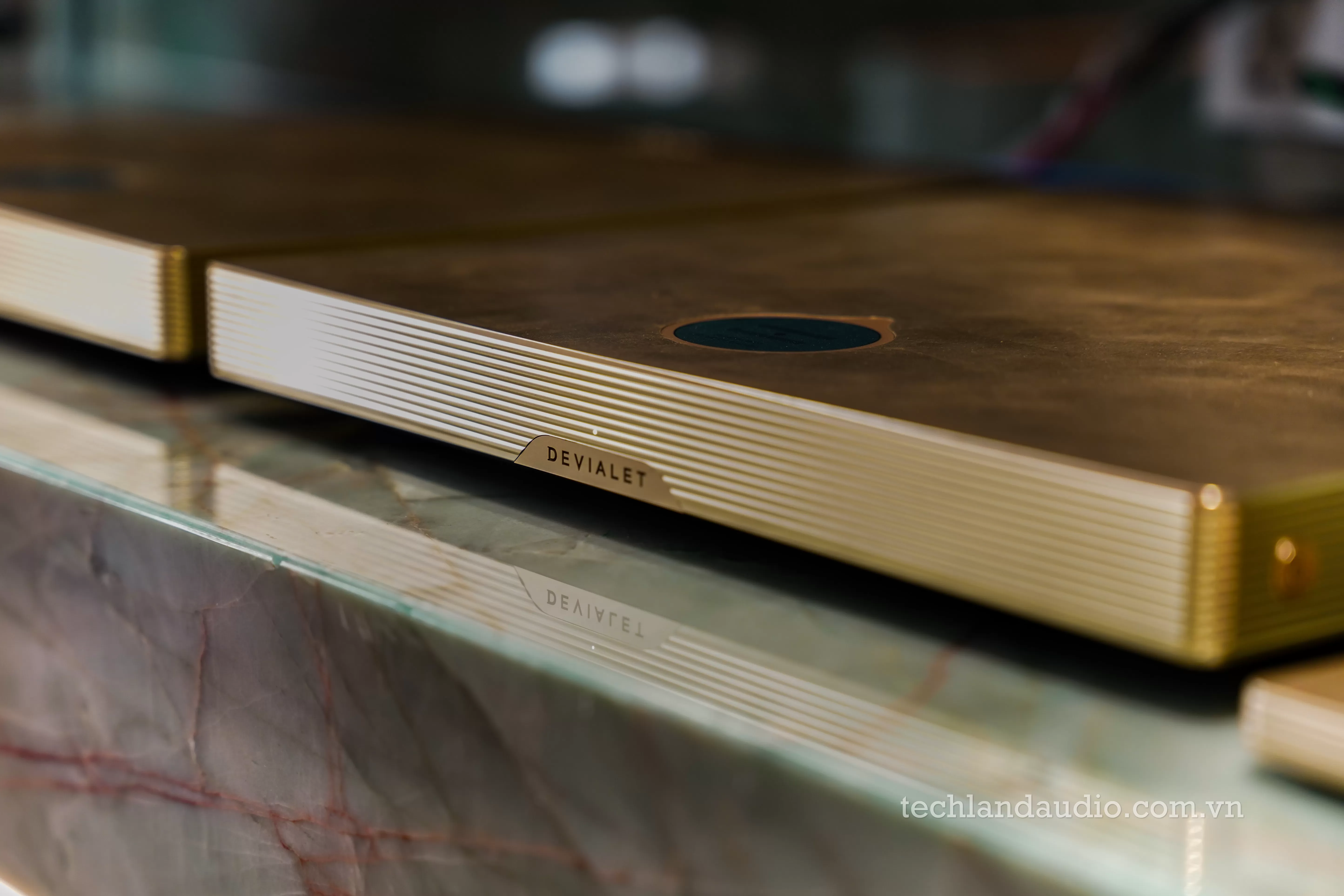 Điểm nhấn vương giả thực sự đến từ "trái tim" của hệ thống: chiếc ampli tích hợp Devialet Astra phiên bản Opéra de Paris. Không còn là màu chrome bạc lạnh lùng thường thấy, phiên bản này khoác lên mình lớp vỏ màu vàng đồng (gold) sang trọng, với các rãnh tản nhiệt chạy dọc thân máy và logo Opéra de Paris tinh xảo. Chiếc điều khiển từ xa đi kèm cũng là một khối kim loại vàng đồng đồng bộ, nặng trịch và mát lạnh trên tay, khẳng định đẳng cấp của chủ nhân. Sự hiện diện của Astra trên kệ đá marble không chỉ là một thiết bị điện tử, mà là một món trang sức lộng lẫy cho căn phòng.
