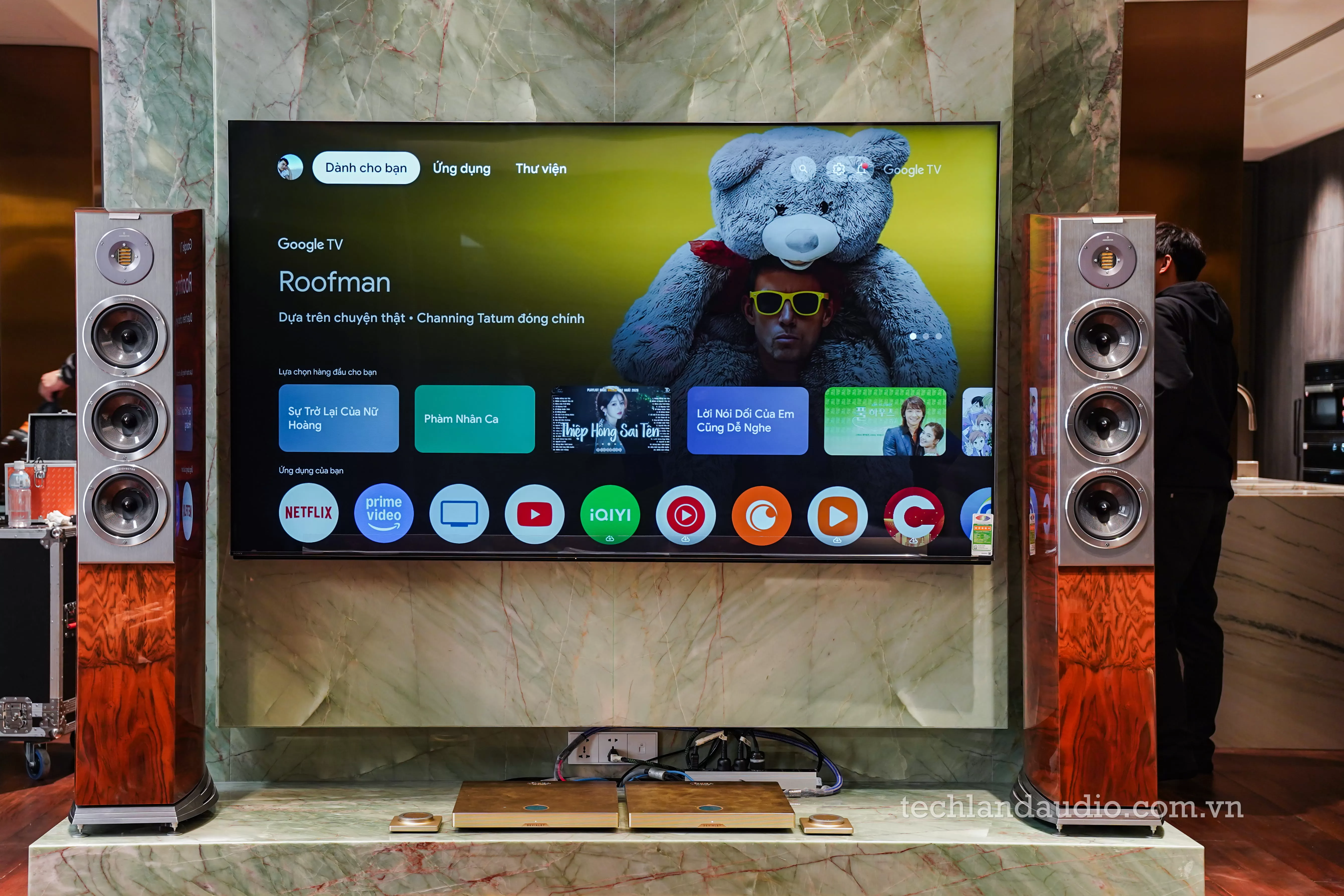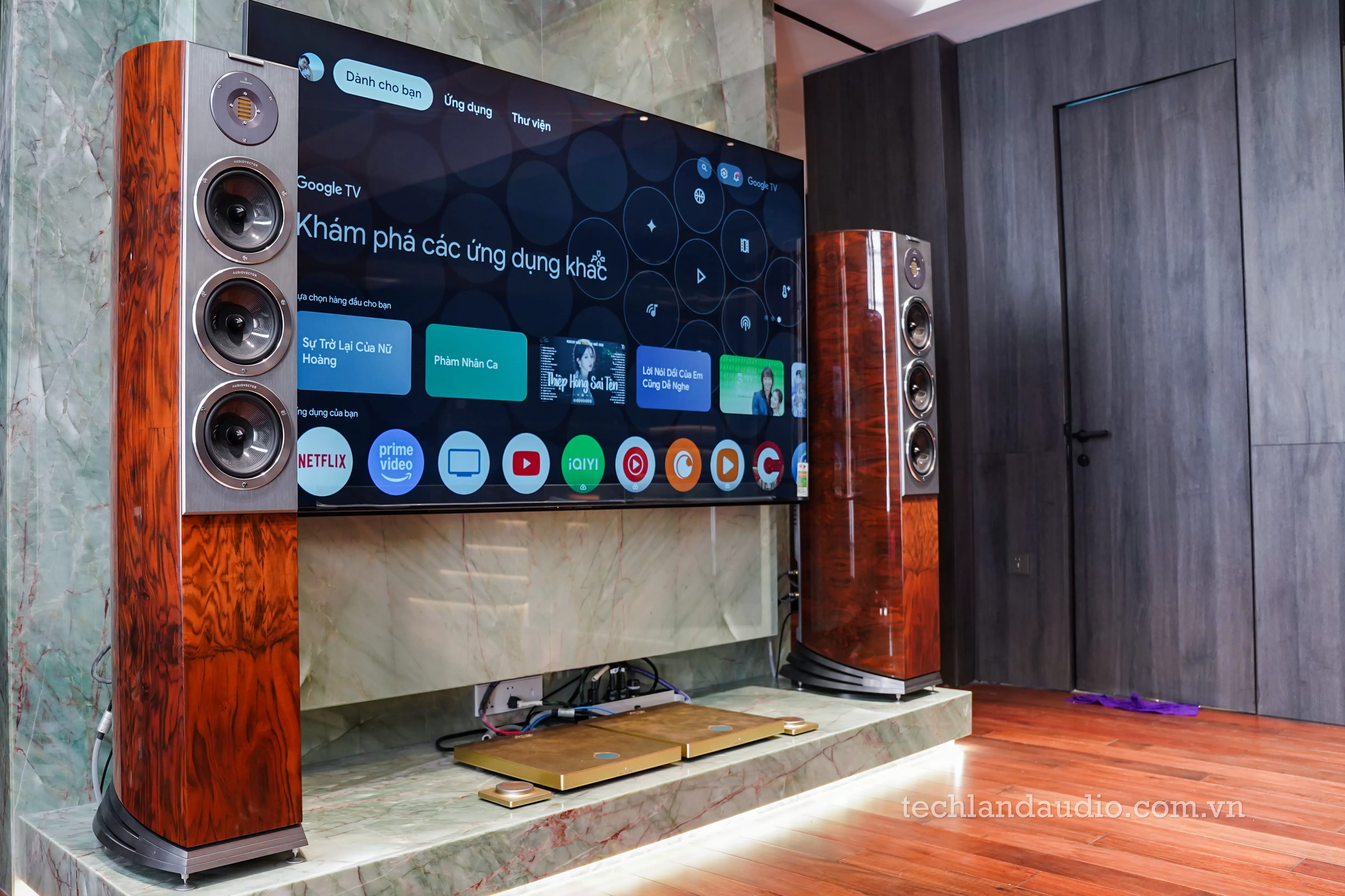 Trên bức tường đá cẩm thạch, chiếc TV màn hình lớn đang hiển thị giao diện Google TV với đầy đủ các ứng dụng streaming phổ biến như Apple TV, Netflix, YouTube.... Đây chính là tuyên ngôn cho vai trò mới của hệ thống hi-end: Trung tâm giải trí số của cả gia đình.