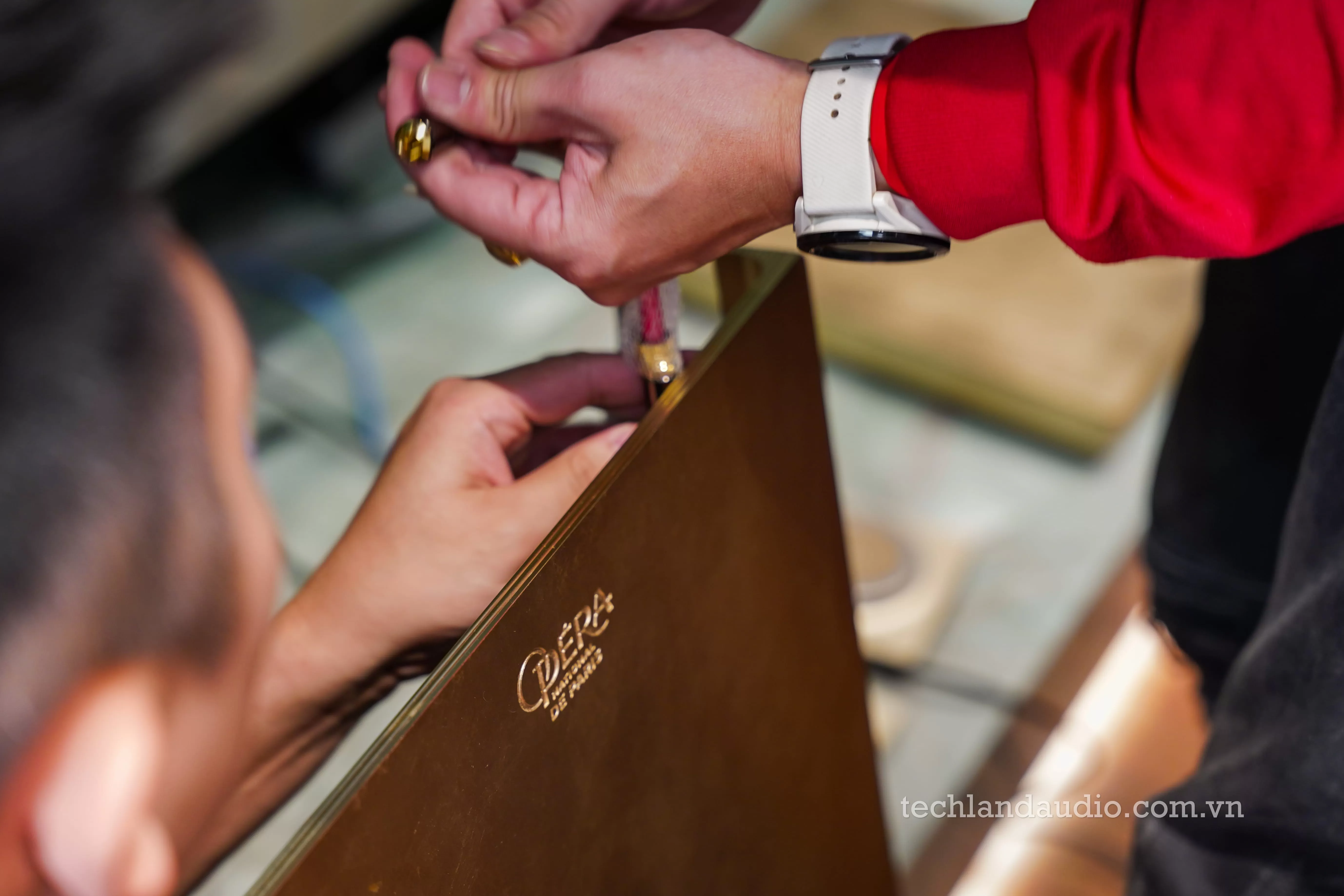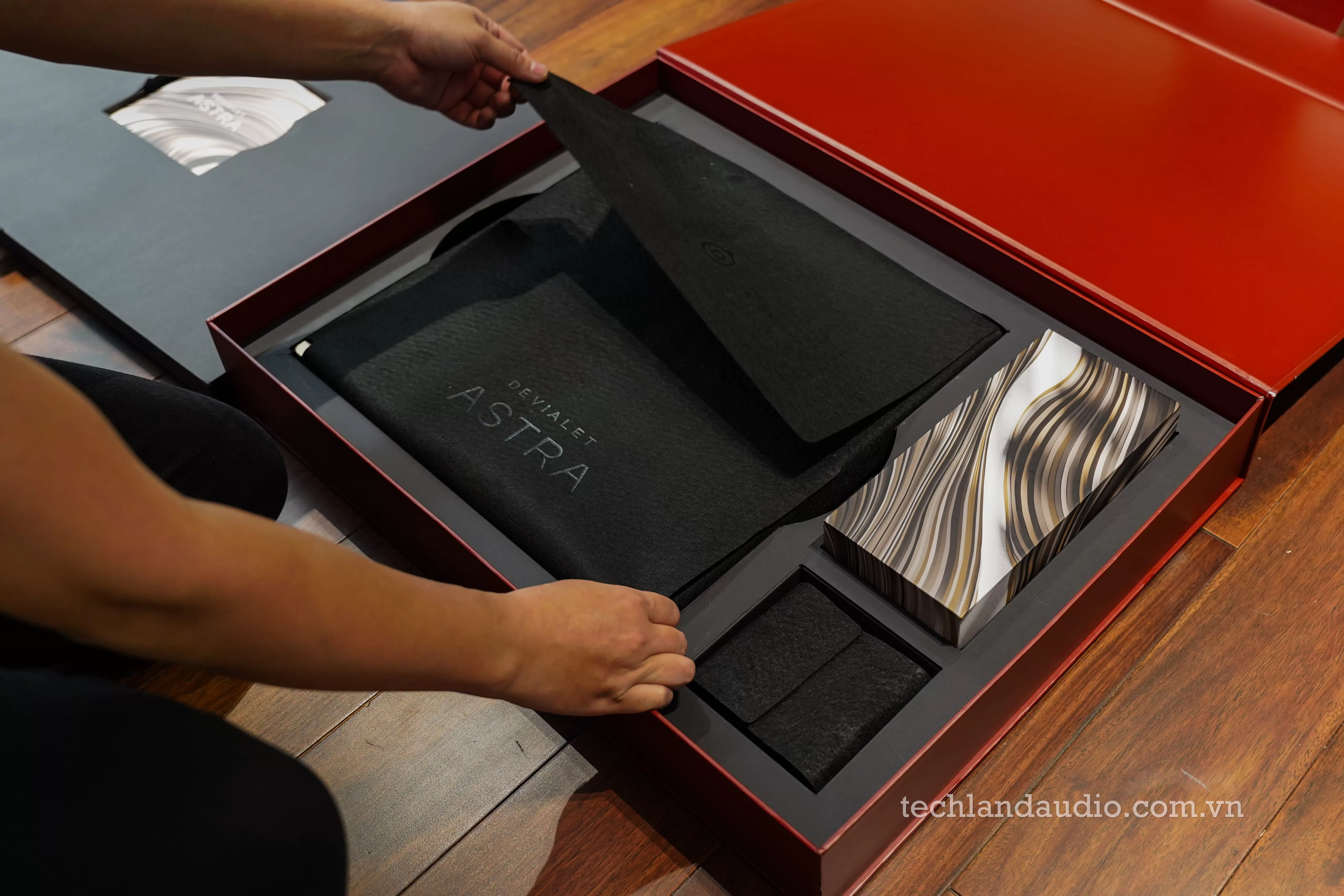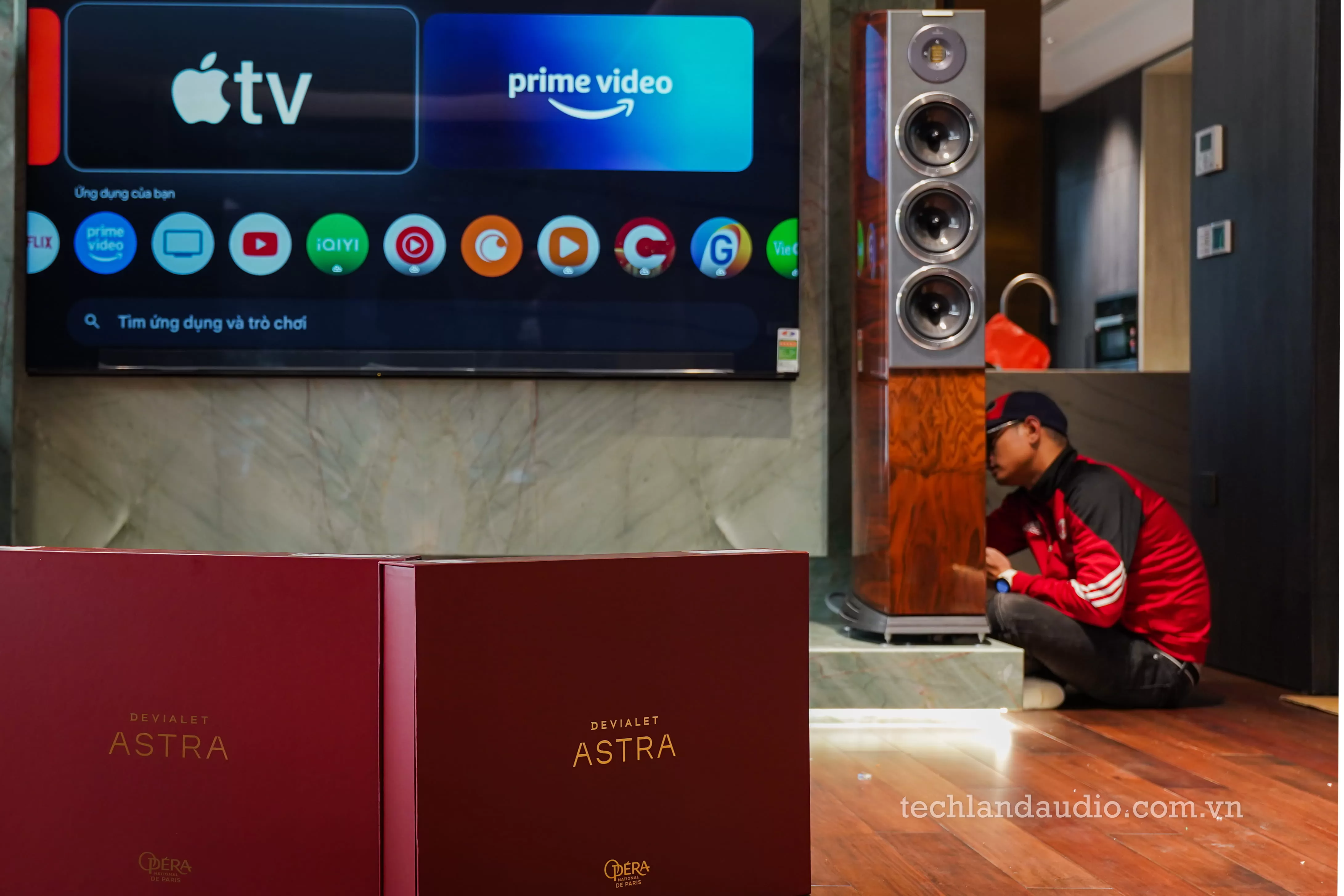 Quá trình lắp đặt được thực hiện bởi các chuyên gia với sự cẩn trọng tuyệt đối, như thể đang nâng niu những báu vật. Hình ảnh người kỹ thuật viên tỉ mỉ kết nối từng sợi dây loa bọc lưới dù cao cấp vào các cọc loa mạ vàng phía sau chiếc ampli Astra vàng óng là minh chứng cho sự trân trọng đối với từng chi tiết nhỏ nhất của hệ thống hi-end. Những chiếc hộp đựng màu đỏ mận sang trọng với dòng chữ nhũ vàng "DEVIALET ASTRA" nằm trên sàn gỗ nâu ấm áp càng làm tăng thêm vẻ trang trọng cho nghi thức "khui hộp" này.