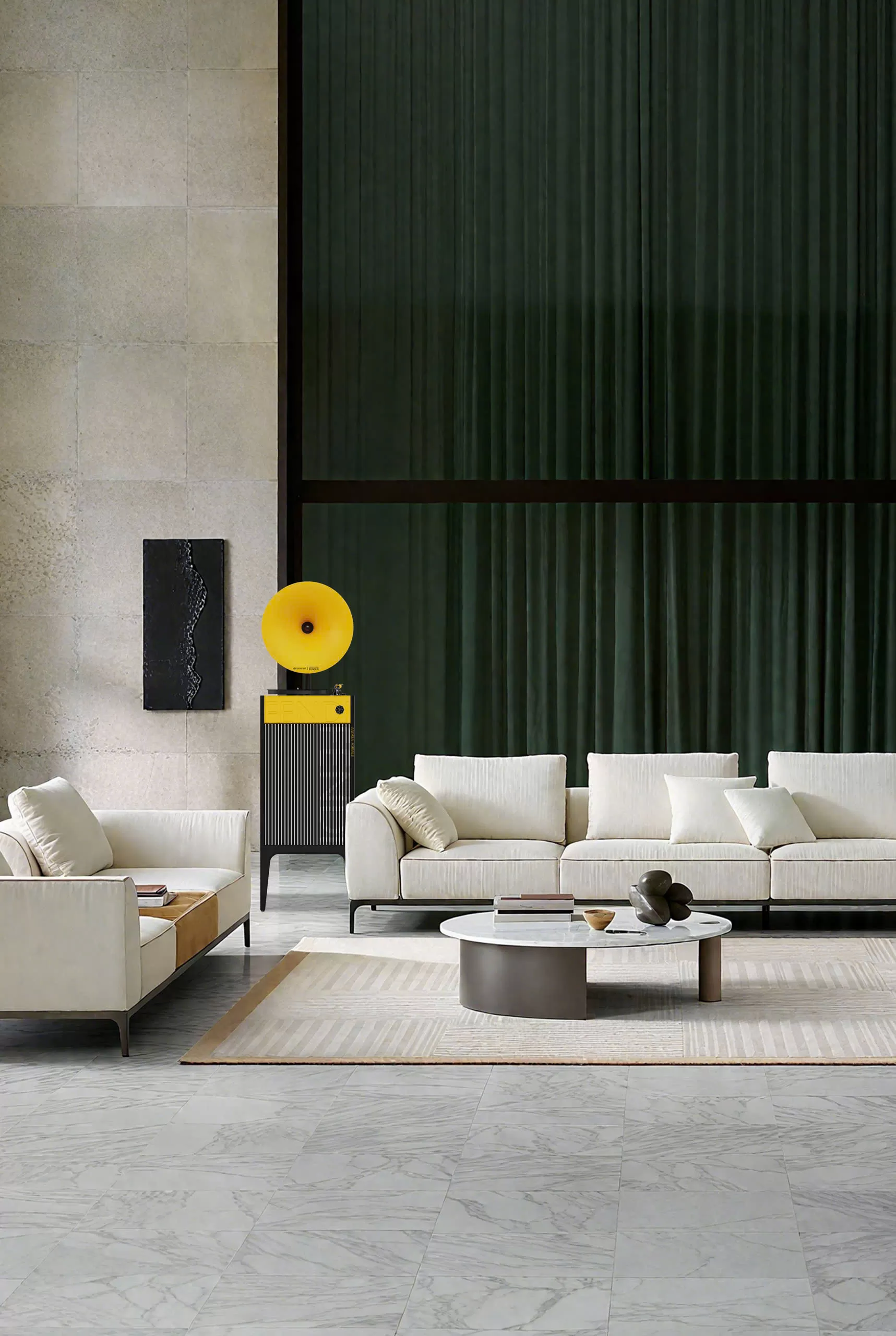 | Chất liệu cao cấp | Bugle kim loại textured sơn tĩnh điện vàng mustard, Base gỗ walnut nguyên khối, Carbon fiber tonearm, Da thật Ý bọc một số chi tiết, Grille vải mesh cao cấp |