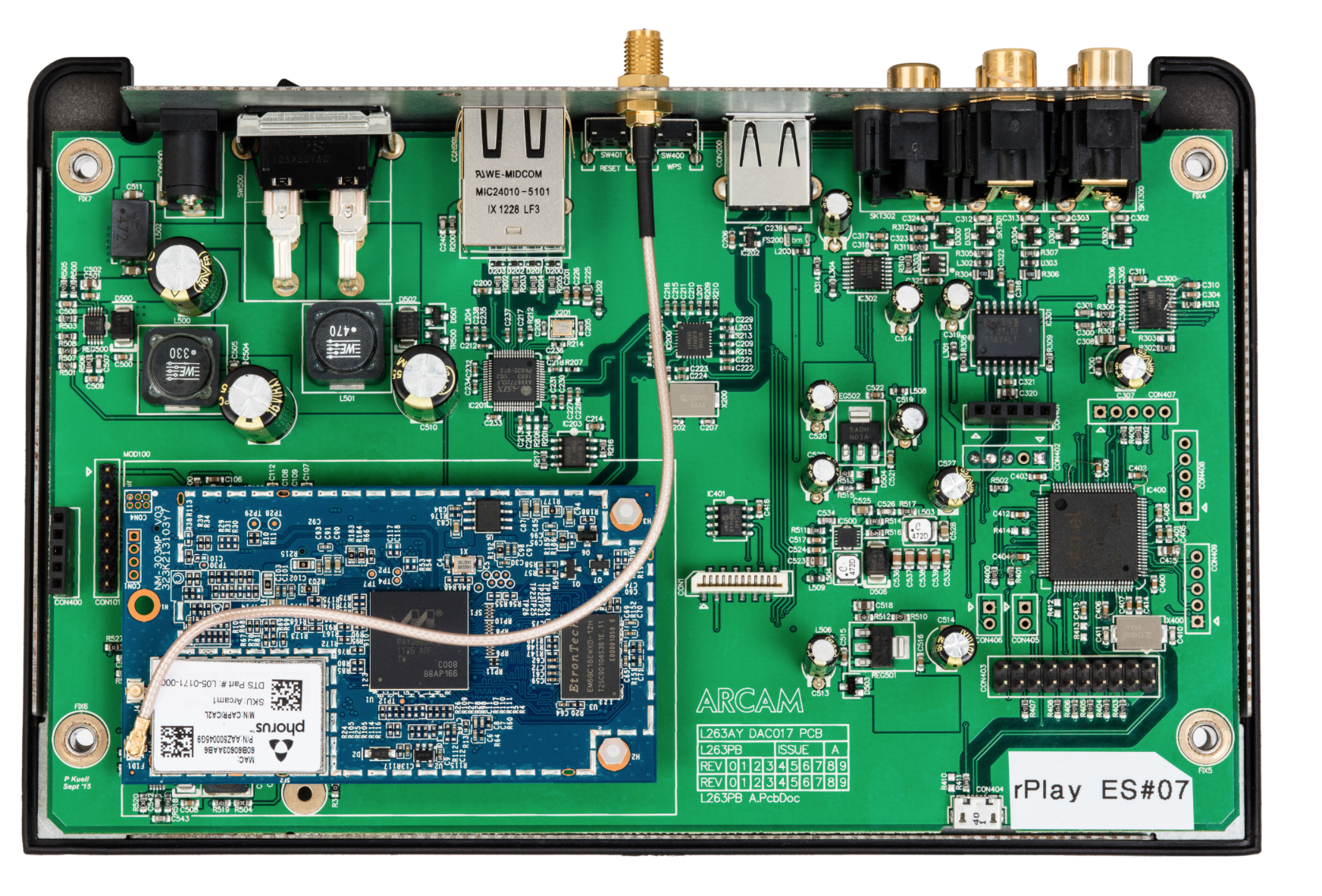 Về mặt hình thức, rPlay vẫn sở hữu phong cách đặc trưng của dòng rSeries và khá giống sản phẩm tiền nhiệm Arcam irDAC-II, nghĩa là mang dáng dấp của một cục phát wi-fi với hình hộp vuông vắn cùng lớp vỏ nhựa đen bóng và một ăng-ten để cải thiện chất lượng wi-fi, mặt trước là đôi đèn hiệu, các cổng kết nối vật lý nằm ở mặt sau, phím chỉnh âm lượng ở mặt trên. rPlay được trang bị chip giải mã cao cấp TI PCM5102 cùng một số cải tiến đáng kể về công nghệ - mà tiêu biểu nhất là bảng mạch in 4 lớp giúp giảm thiểu tối đa nhiễu tạp âm qua lại giữa các thiết bị, đồng thời xóa bỏ hiện tượng jitter (trễ tín hiệu) dẫn đến giảm độ chính xác của các màn trình diễn.