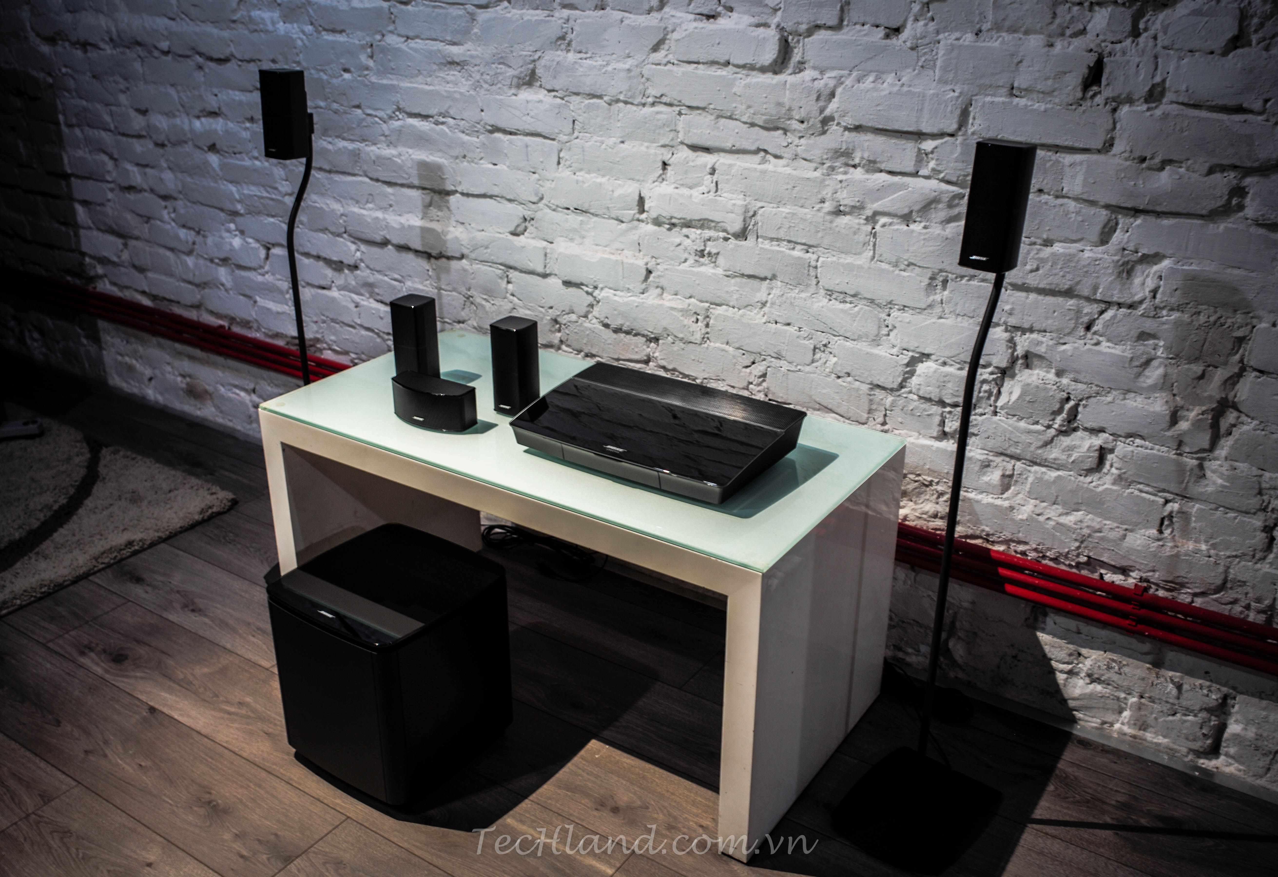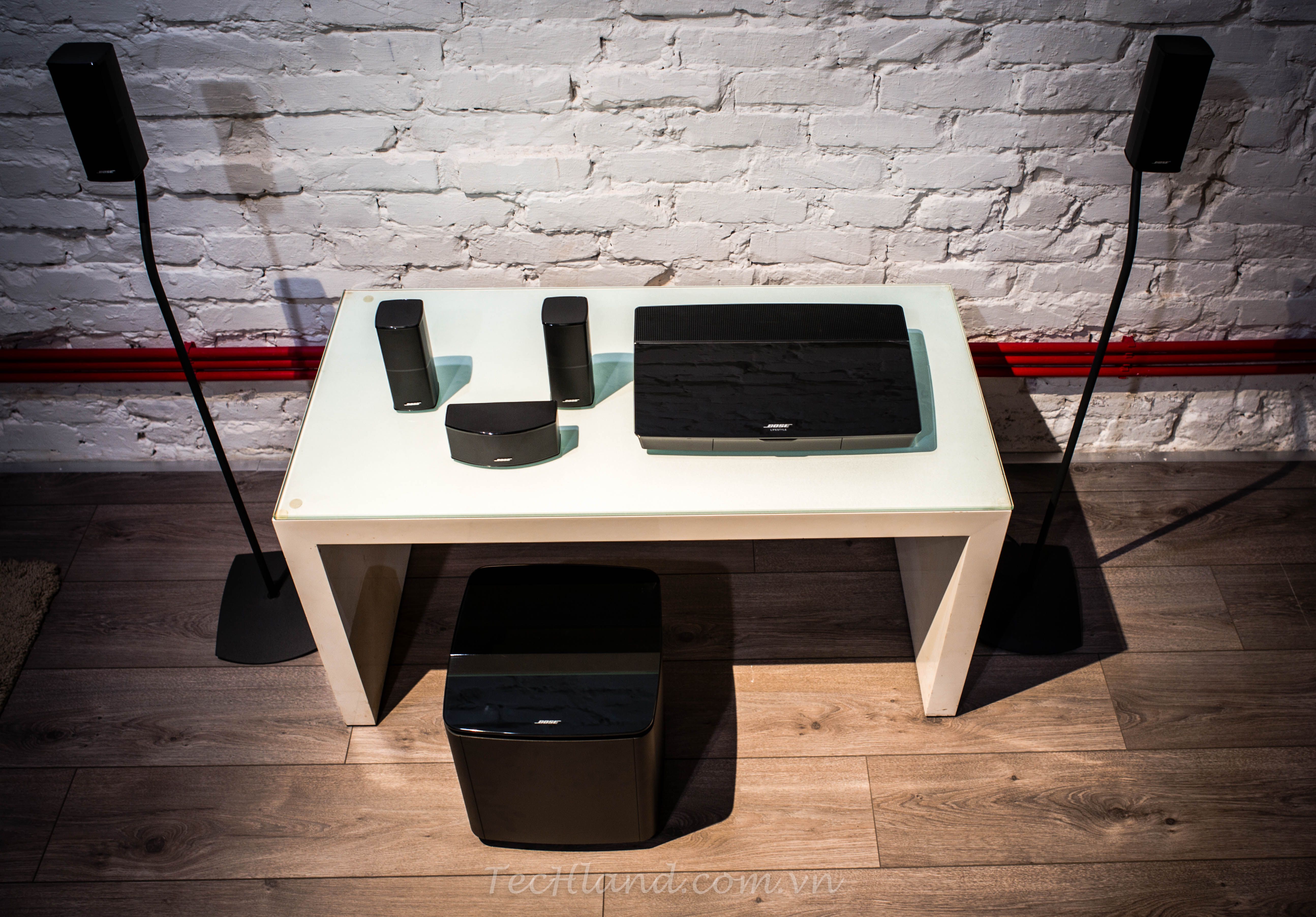 Không chỉ vậy, cả 2 loa surround và loa subwoofer còn có thể kết nối không dây qua wi-fi, tạo điều kiện thuận lợi tối đa về mặt sắp xếp, bố trí trong các không gian khác nhau. Đặc biệt, loa subwoofer với củ loa đường kính 20cm hướng lên trên và ứng dụng công nghệ QuietPort không chỉ mang đến những tiếng trầm mạnh mẽ, chính xác mà còn có độ lan tỏa cực tốt và hoàn toàn không xuất hiện tình trạng ù, rền hay bị kéo đuôi, vốn là nhược điểm dễ thấy ở rất nhiều bộ dàn xem phim all-in-one đang có mặt trên thị trường. Hơi đáng tiếc khi Bose đã bỏ chức năng đọc đĩa ở khối điều khiển trung tâm, cũng không có cổng USB nhận tín hiệu số, đồng nghĩa với việc người dùng phải dùng thêm nguồn phát rời khi muốn nghe CD, xem DVD, blu-ray hay phim HD.